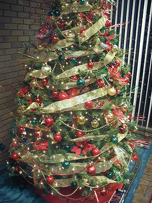 The Entrance features two magnificent trees on either side of the front door. This one is called the Ribbon Tree, and is done in the traditional red, gold, and green.