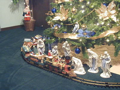 The spare bedroom tree has its own train, too. This one is also a "G" scale, but the only one that is not an LGB (German-made) train. This is an animated train that features moving figures on several of the cars.